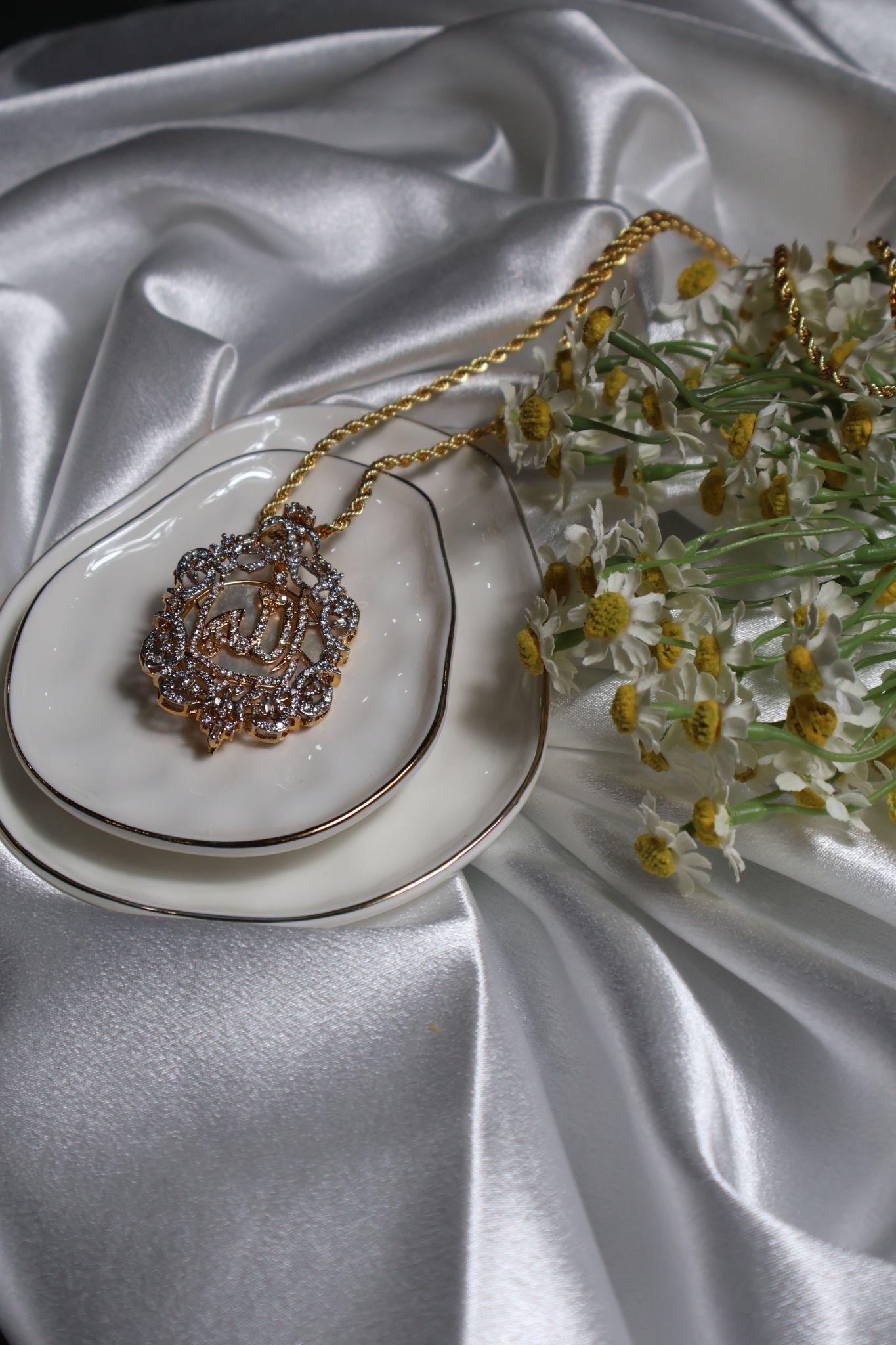 Modern and meaningful. Gold and silver stonework surrounds a luminous mother of pearl, centered with the name of Allah.